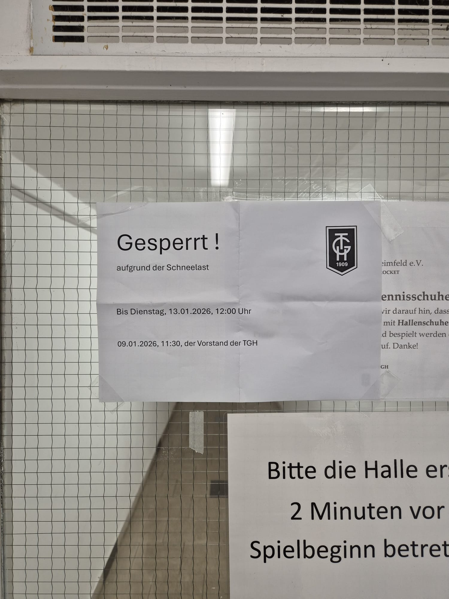 Die Tennishalle ist ab sofort bis Dienstag, 13.01.2026, 12:00 aus Sicherheitsgründen gesperrt.
